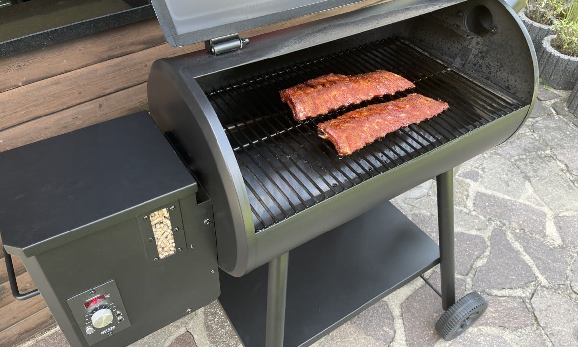 Die Grillfläche des Pelletsmokers ist 66,6 cm breit und 39,3 cm tief. Wir haben unsere Ribs mittig im Smoker platziert, aber im Fall der Fälle könnte man problemlos 6-7 Leitern auf der Grillfläche platzieren können. Es ist genug Platz für 4-5 Schweinenacken, so dass man auch für größere Events durchaus mal 15 kg in den Smoker bekommt. Und wenn alle Stricke reißen, gehört auch noch ein Warmhalterost mit 15 cm Tiefe zum Lieferumfang und man kann optional eine zweite Ebene schaffen. Die Ribs waren nach gut 5 Stunden butterzart, perfekt gegart und hatten eine dezente Rauchnote.