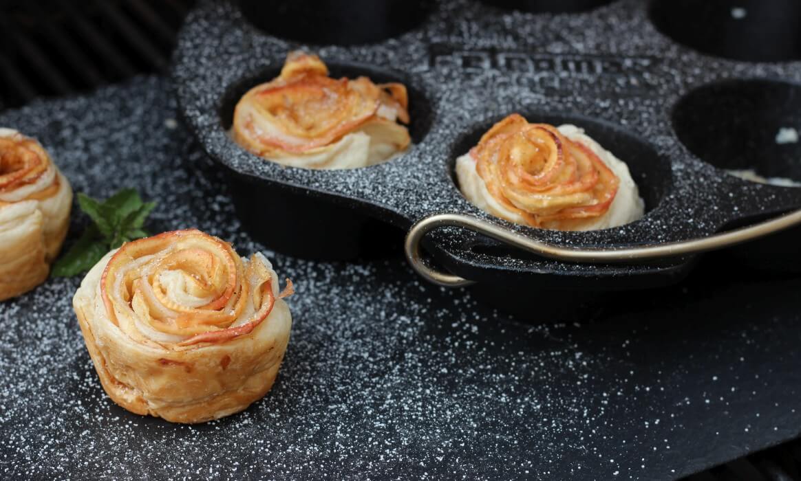 - Die fertigen Rosen werden in eine Muffinform gegeben und für ca. 30 Minuten bei 180°C gebacken. Die Backzeit hängt immer etwas von der Größe der Rosen ab und kann ggf. auch etwas länger sein. Wir haben die Apfelrosen auf dem Kamado Joe Classic II Keramikgrill mit eingelegtem Deflektorstein in der gusseisernen Petromax Muffinform mf6 gebacken. Natürlich geht das auch im Backofen bei Ober-/Unterhitze. Vor dem Servieren sollte man die Rosen noch mit etwas Puderzucker bestreuen. Dazu passt auch prima eine Kugel Vanilleeis und frische Früchte.
