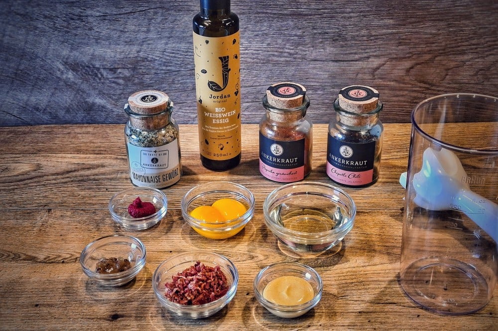 - Theoretisch sind wir mit dem Stabmixer fertig und es kann von Hand untergerührt werden. Wer mag, kann aber auch weiterhin gerne den Stabmixer nutzen. Jetzt wird das Tomatenmark, das Mayonnaise-Gewürz, das geräucherte Paprikapulver, sowie die Chipotle Chili hinzugegeben und nochmal kräftig verrührt, bzw. gemixt. Zu guter Letzt wird unser Hauptakteur hinzugefügt, der fein gehackte Bacon. Die Bacon-Mayonnaise ist jetzt fertig, sollte allerdings noch für 2-3 Stunden in den Kühlschrank, damit sich der Geschmack so richtig entfaltet. Vor dem Servieren wird die Baconnaise noch mit etwas Salz und Pfeffer abgeschmeckt. Da frisches Ei verwendet wird, sollte die Baconnaise zeitnah aufgebraucht werden.