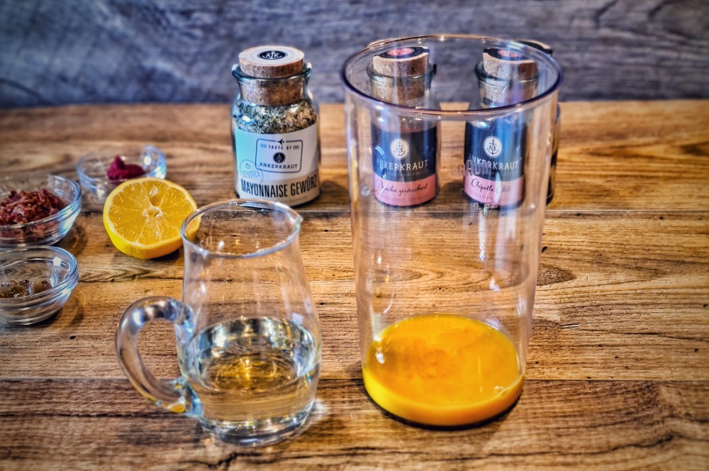 Jetzt beginnt die Zubereitung der eigentlichen Mayonnaise. Dafür werden die Eier getrennt, da wir lediglich das Eigelb benötigen. Das Eiklar kann aufgehoben und für andere Rezepte zeitnah weiterverwendet werden. In ein hohes Gefäß, bzw. Mixbecher werden nun das Eigelb, der Senf, der Essig, das Baconfett und ein Spritzer Zitronensaft gegeben. Anschließend wird alles einmal kurz mit einem Stabmixer vermengt. Jetzt wird das Sonnenblumenöl in einem dünnen Strahl ganz langsam hinzugegeben, während der Mixer auf dem Gefäßboden eingeschaltet ist. Nach ein paar Sekunden merkt man schon, dass das Öl mit der Ei-Essig-Senf-Mischung emulgiert, sprich sich verbindet. Der Mixstab wird jetzt langsam immer höher gezogen, während das Öl im dünnen Strahl weiter hinzugegeben wird. Wenn sich alle Komponenten verbunden haben, ist die Grundmayonnaise auch schon fertig.