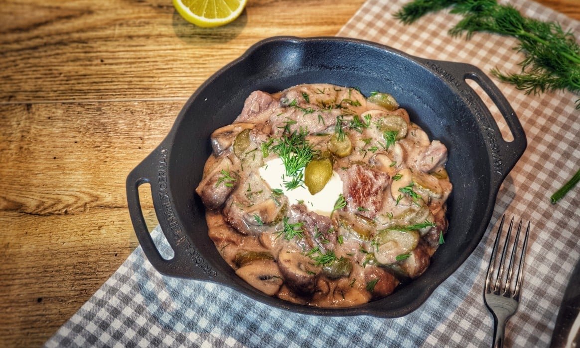 Jetzt werden die Pilze und die Zwiebelwürfelchen in die Pfanne gegeben, in der die Filetspitzen angebraten wurden und bei mittlerer Hitze goldgelb gebraten. Dafür sollte ggf. noch ein wenig Butter in die Pfanne gegeben werden. Sobald die Pilze und die Zwiebeln Farbe angenommen haben, wird das Mehl darüber verteilt und alles ordentlich durchgeschwenkt. Anschließend wird die Pfanne mit der Hälfte des Fonds abgelöscht und verrührt. Jetzt wird die Sauce langsam dicker und der Rest des Fonds kann dazu gegossen werden. Die Sauce wird nochmal aufgekocht und dann wird die saure Sahne, der Senf, die Gurken (samt Gurkenwasser) und der Dill hinzugegeben. Dann wird die Hitze reduziert und das Fleisch wird samt dem Fleischsaft hinzugegeben, untergehoben, mit etwas Zitronensaft abgeschmeckt und sofort serviert.