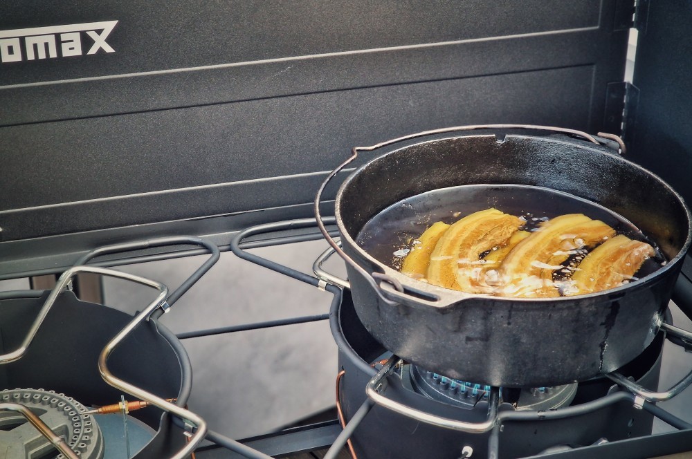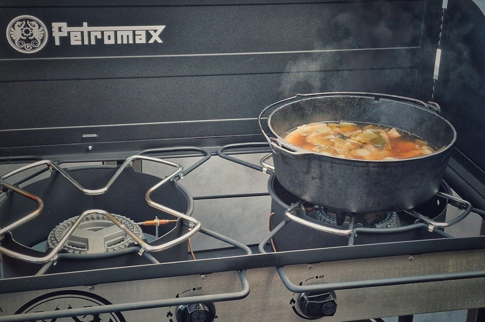 Weiter geht es am Kochtopf, bzw. am gusseisernen Dutch Oven. Wir haben unsere Chicharrón auf dem Petromax Gastisch ge-90-s zubereitet. Das Wasser wird im Dutch Oven (Petromax Feuertopf ft6) erhitzt. Die Schweinebauchscheiben werden mit den Zwiebelstücken, dem Knoblauch, sowie den Lorbeerblätter und dem Pfeffer in den Dutch Oven gegeben und für 45-60 Minuten bei mittlerer Hitze gekocht.