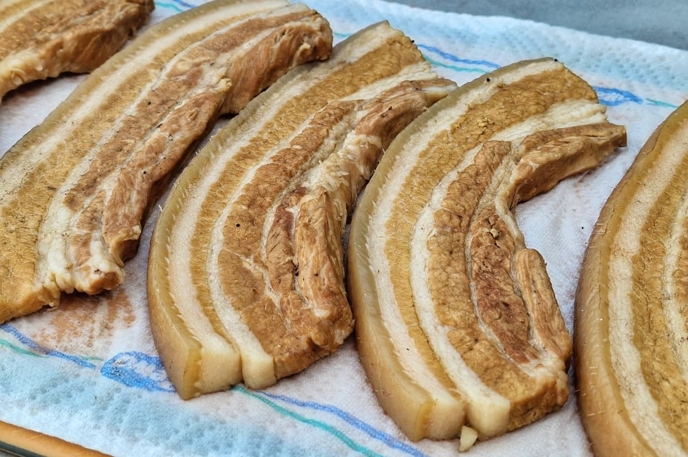 In der Zwischenzeit sollten die Schweinebauchscheiben fertig gekocht sein. Sie werden aus dem Sud genommen und mit Küchenpapier trocken getupft. Dies ist besonders wichtig, da es sonst beim Frittieren sehr gefährlich werden könnte.