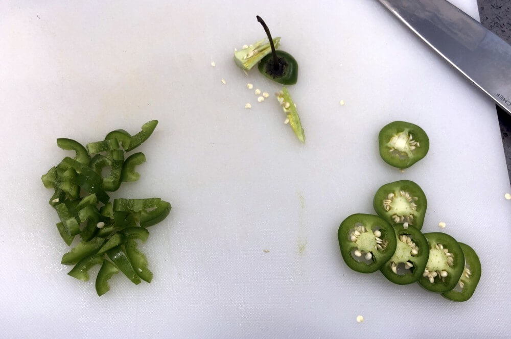 Nun wird der Teig vorbereitet. Von der Jalapeno werden zunächst 6 Ringe abgeschnitten. Diese dienen als Topping für die Muffins. Die restliche Jalapeno wird in kleine Stücke geschnitten.