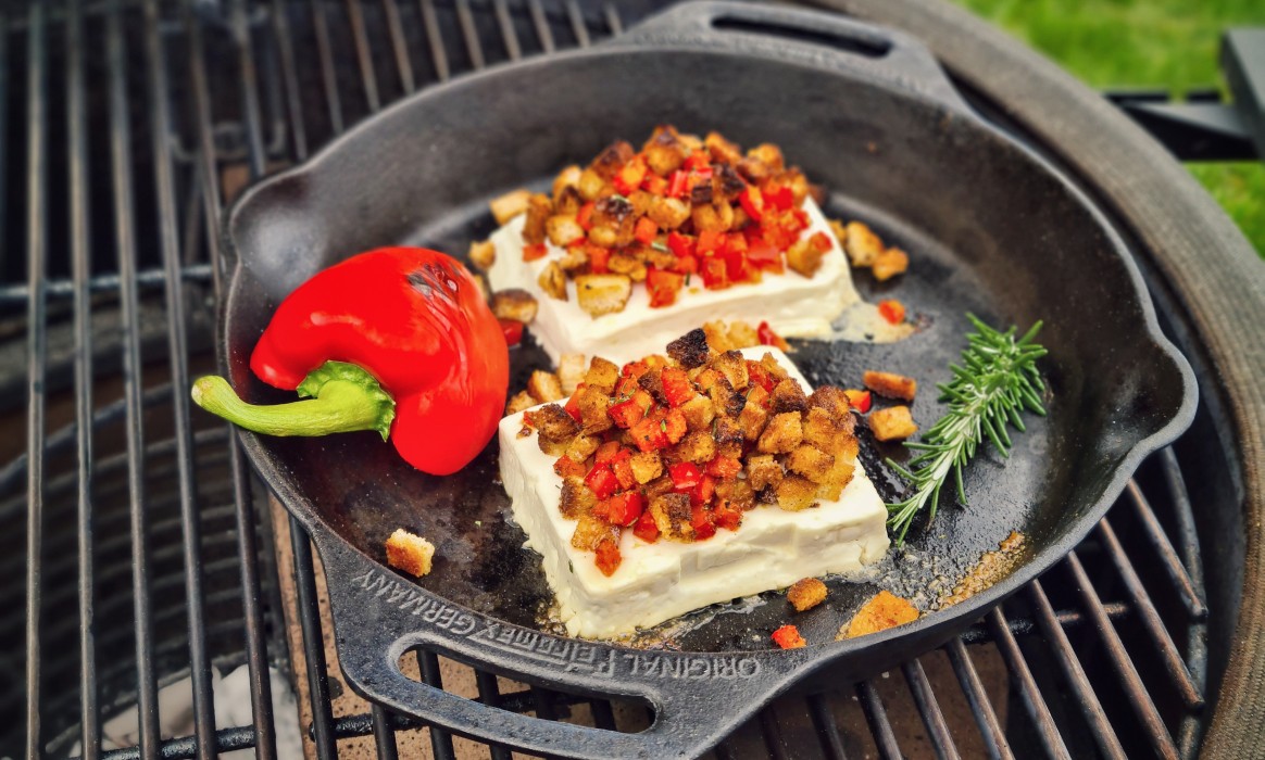 - Die gusseiserne Pfanne wird jetzt kurz mit einem Küchenpapier grob von etwaigen Krümeln gesäubert und der Feta hineingelegt. Darauf kommen ein paar Spritzer des Olivenöls und pro Käse ein Teelöffel des Schafskäse-Gewürzes. Auf dem Feta wird die Croûtons-Paprikamischung großzügig verteilt und im geschlossenen Grill indirekt bei 200°C für ca. 10-12 Minuten gebacken, bis der Käse leicht angeschmolzen ist.