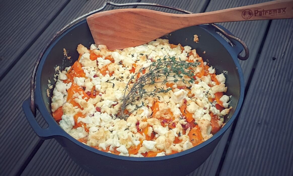 Der Herbst ist da und mit ihm kommen tolle Gewächse, die sich in den kühleren Tagen ideal für den Dutch Oven anbieten wie zum Beispiel der Kürbis. Der an sich eigentlich fast schon geschmacklose Kürbis bekommt mit unserem Rezept definitiv seine Daseinsberechtigung, denn aus ihm zaubern wir mit relativ wenig Aufwand ein richtig leckeres Kürbis-Gratin. Und da mit Speck bzw. Bacon bekanntlich alles besser schmeckt, darf dieser neben dem würzigen Feta natürlich nicht fehlen.