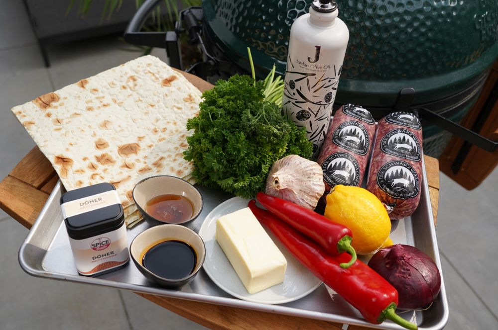 Zubereitet haben wir die Lavash Kebap Spieße bei 200°C indirekter Hitze auf dem Big Green Egg Large Keramikgrill. Man könnte die Spieße auch bei niedriger direkter Hitze grillen. Da das Brot aber recht schnell dunkel wird haben wir uns ausschließlich für indirekte Hitze entschieden. Dadurch garen die Spieße gleichmäßiger, das Hackfleisch bleibt saftig und das Lavash-Brot wird an den äußeren Schnittkanten knusprig. Die Garzeit beträgt etwa 25 Minuten bei 200°C.
