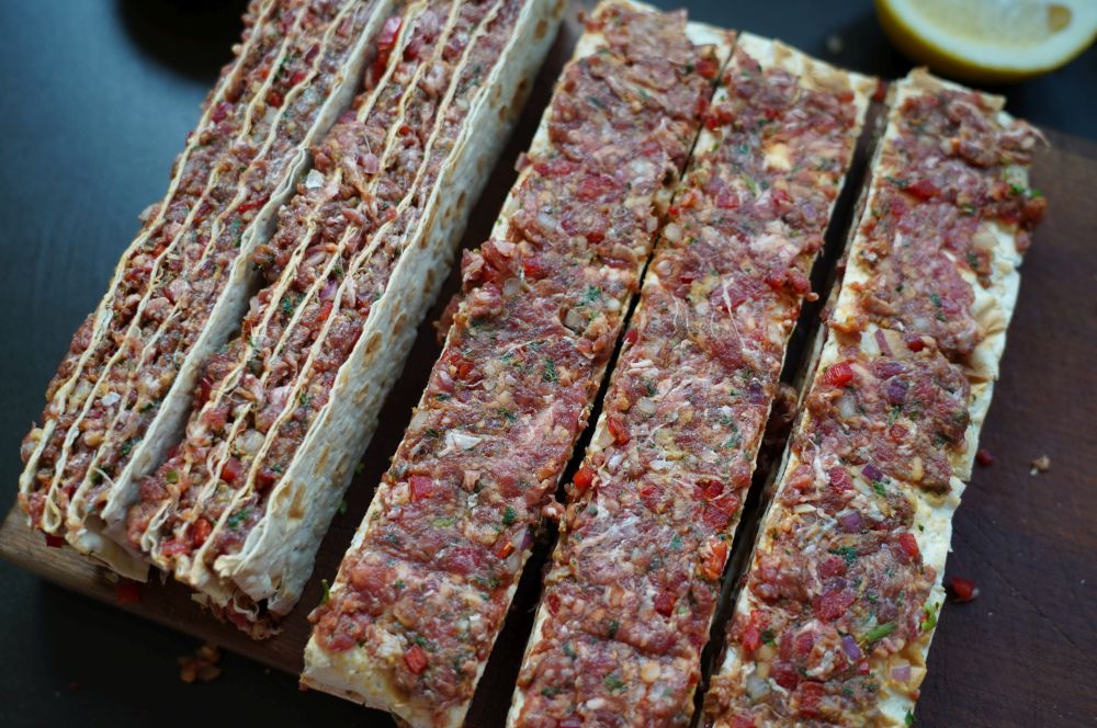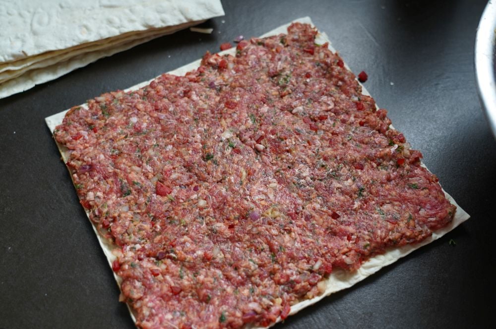 Wichtig ist es, dass die Brote möglichst quadratisch sind. Unsere Lavash-Brote waren gefaltet in der Packung etwa 44 x 22 cm groß. Diese haben wir dann einfach mittig geteilt, so dass Quadrate mit 22 cm Seitenlänge entstanden sind. Wer runde Tortilla-Wraps verwendet schneidet diese ebenfalls quadratisch zu. Dann werden die Wraps dünn mit der Hackfleischmischung bestrichen. Es wird dabei übereinander gestapelt. Immer abwechselnd Wrap und Hackfleisch. Wichtig ist dabei, dass alles gleichmäßig dick wird. Mit einem Kilogramm Hackfleisch lassen sich 4-5 Fladen bestreichen, je nachdem wie dick die Hackfleischmasse aufgetragen wird.