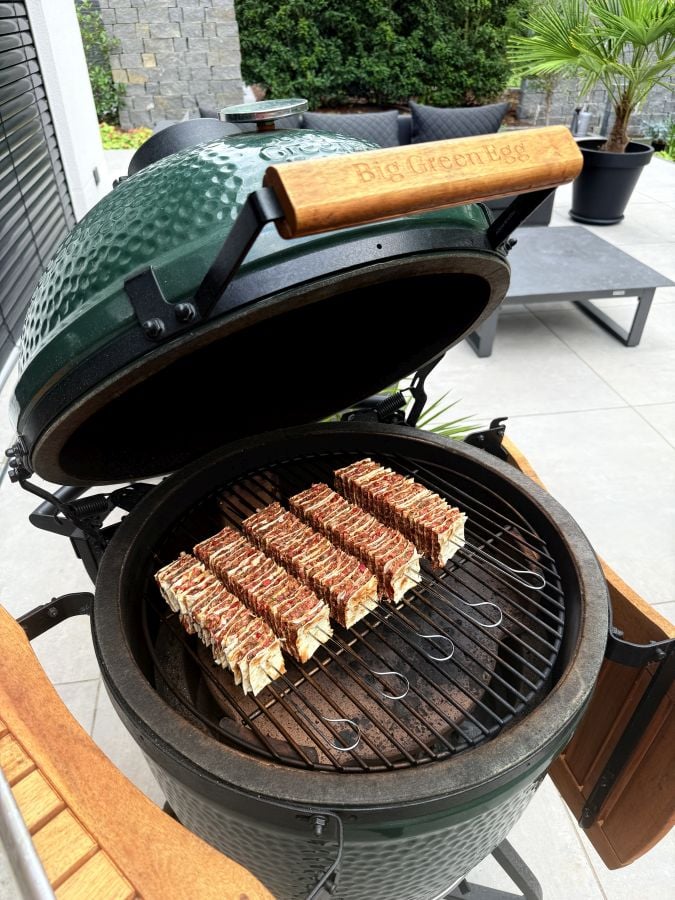 - Zubereitet haben wir die Lavash Kebap Spieße bei 200°C indirekter Hitze auf dem Big Green Egg Large Keramikgrill. Man könnte die Spieße auch bei niedriger direkter Hitze grillen. Da das Brot aber recht schnell dunkel wird haben wir uns ausschließlich für indirekte Hitze entschieden. Dadurch garen die Spieße gleichmäßiger, das Hackfleisch bleibt saftig und das Lavash-Brot wird an den äußeren Schnittkanten knusprig. Die Garzeit beträgt etwa 25 Minuten bei 200°C.