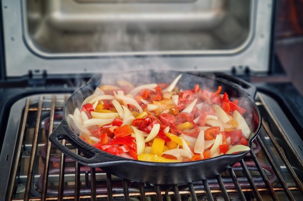 - Wir haben das Letscho auf dem Severin SEVO GTS Elektrogrill in einer gusseisernen Pfanne (Petromax Feuerpfanne fp25h) zubereitet. Der SEVO wird auf 220°C eingestellt und aufgeheizt. Das Öl wird mit in die Pfanne gegeben und aufgeheizt. Dann kommen die Paprikastreifen in die Pfanne. Diese werden für ca. 5 Minuten angeröstet und dabei regelmäßig gewendet. Danach kommen die Zwiebeln und der Knoblauch hinzu. Beides wird jetzt ebenfalls für weitere 3 Minuten unter Rühren angebraten.
