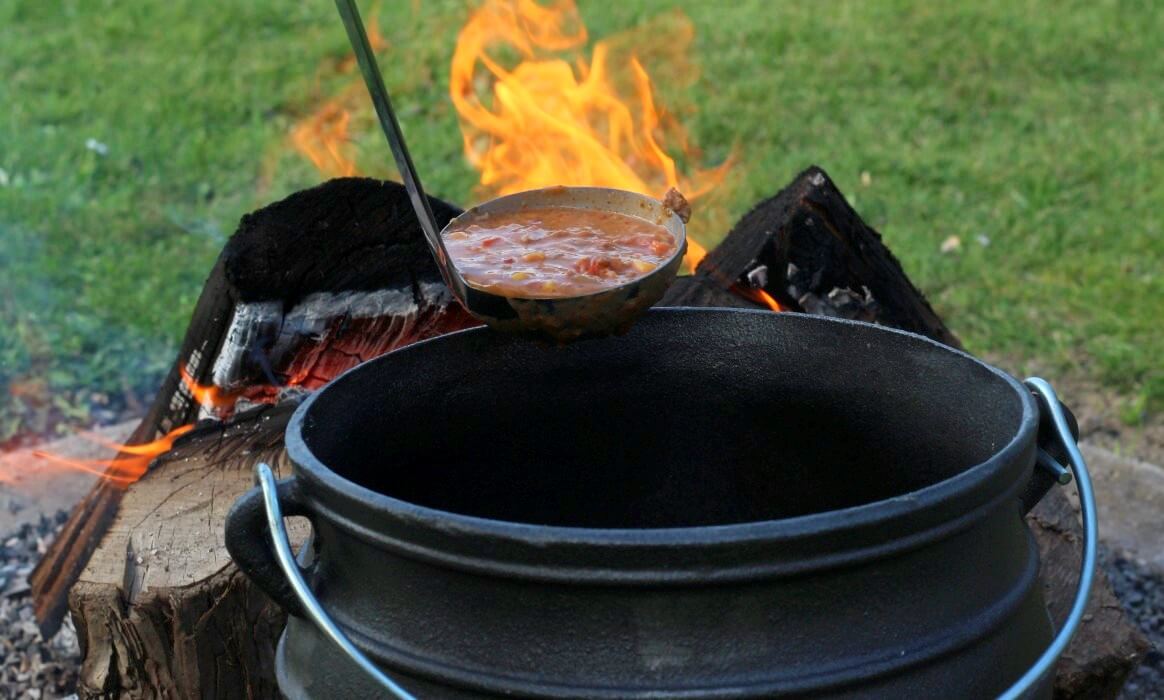 Pizzasuppe aus dem Potjie ist schnell und einfach gemacht. Auf offenem Feuer in einem gusseisernen Potjie zubereitet schmeckt die Suppe erst richtig gut.
