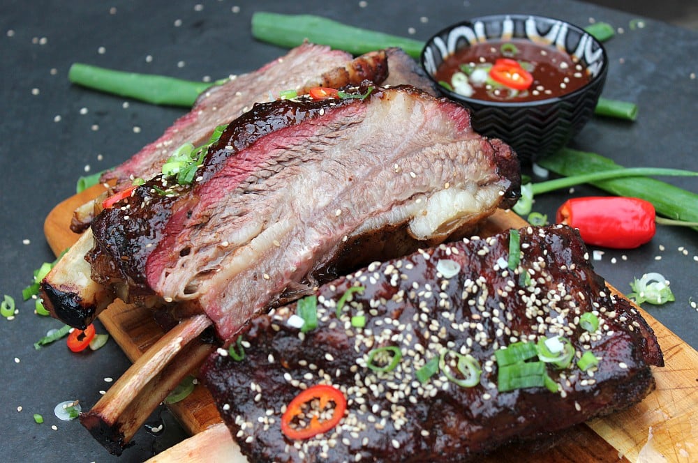 Zwischendurch werden die Frühlingszwiebeln und die Chili in feine Ringe geschnitten. Die Beef Ribs werden vorsichtig vom Grill genommen und zwischen den Knochen mit einem scharfen Messer aufgeschnitten. Vor dem Servieren werden die Beef Ribs Asia Style mit geröstetem Sesam und den Zwiebel- und Chiliringen bestreut. Zum Fleisch wird die restliche Sauce gereicht.