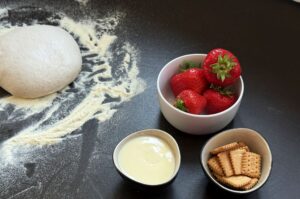 Als Basis für unsere Erdbeer-Pizza dient ein klassischer neapolitanischer Pizzateig. Man kann für die süße Dessert-Pizza aber auch mit jedem anderen Pizzateig als Basis verwenden. Dieser Teig sollte möglichst 48 oder 72 Stunden vor der Pizzazubereitung angesetzt werden, da er Zeit zum Reifen braucht. Wenn der Teig fertig und portioniert ist, wird er auf die gewünschte Größe ausgearbeitet. Für eine neapolitanische Pizza mit rund 28-30 cm Durchmesser wird ein Teigballen mit etwa 270-280 g Gewicht benötigt. Damit der Teig gut verarbeitet werden kann und nicht auf der Arbeitsplatte klebt, wird diese großzügig mit Semola bestreut. Der Teigballen wird vorsichtig mit den Händen zu einer runden Pizza ausgeformt. Mit den Händen wird der Teig von innen nach außen bearbeitet und dabei auf die gewünschte Größe gezogen. Dabei sollte keinesfalls die Luft aus dem Rand gedrückt werden.