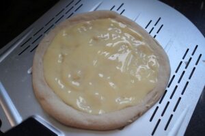 Wenn der Pizzateig ausgeformt ist, wird er gleichmäßig mit dem Vanillepudding oder der Vanillesauce bestrichen. Das ist auch schon alles, denn die Pizza wird nur mit der Sauce gebacken. Die restlichen Toppings kommen erst nach dem Backen auf die Pizza. Wenn die Pizza mit der Vanillesauce bestrichen ist, ist sie bereit für den Pizzaofen, der bereits vorgeheizt sein sollte. Die Pizza wird vorsichtig, aber mit Schwung auf den Pizzaschieber gezogen, welcher vorab mit ein wenig Semola bestreut wird.
