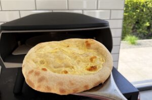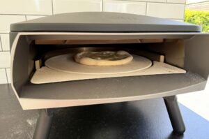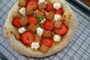 Zubereitet haben wir unsere Erdbeer-Pizza im Witt Piccolo Rotante 16″ Pizzaofen. Der Pizzaofen wird für ca. 15 Minuten auf Maximalleistung aufgeheizt. Beim Aufheizen sollte auch der drehende Pizzastein eingeschaltet sein, damit dieser gleichmäßig aufgeheizt wird. Wenn der Pizzaofen die gewünschte Temperatur erreicht hat, wird die Hitze auf Minimalstellung reduziert und die Pizza wird vorsichtig, aber mit Schwung vom Pizzaschieber in den vorgeheizten Ofen befördert. Wichtig ist, dass der Ofen beim Backen nicht zu heiß ist, da die Vanillesauce sonst Blasen wirft und verbrennt.