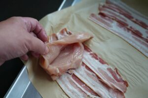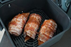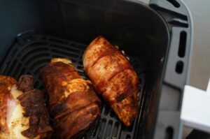 Wenn die Hähnchenbrustfilets gefüllt sind, werden die von außen großzügig mit der Kikeriki-Gewürzmischung gewürzt. Pro Hähnchenbrust werden 3-4 Streifen Bacon leicht überlappend nebeneinander ausgelegt. Die gefüllte Hähnchenbrust wird dann in den Bacon gewickelt, von außen nochmal gewürzt und dann in den Korb der Heißluftfritteuse gegeben. Wichtig dabei ist, dass sie dann so hingestellt wird, dass sich die Seite mit der Öffnung oben befindet, damit die Füllung bei der Zubereitung nicht ausläuft.