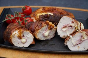 Wenn die Hähnchenbrustfilets vorbereitet und aufgeschnitten sind, werden sie mit je einer Scheibe Schinken und Käse gefüllt. Beim Käse ist erlaubt, was schmeckt. Es sollte jedoch ein Käse mit guten Schmelzeigenschaften sein. Wir verwenden gerne Emmentaler. Wer möchte, kann die Hähnchenbrustfilets jetzt noch mit Zahnstocher zusammenstecken. Da wir sie aber noch on Bacon wickeln, ist das nicht zwingend notwendig.