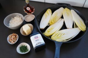Zunächst wird der Chicorée vorbereitet. Die äußeren Blätter werden abgezogen, falls sie bereits welk und trocken werden. Dann wird die Chicorée der Länge nach halbiert. Der Strunk wird dabei nicht entfernt, damit er nicht auseinanderfällt. Die halbierten Chicorée-Knospen werden dann in eine feuerfeste Form gelegt. Wir haben dafür die gusseiserne Petromax Feuerpfanne fp30t verwendet.