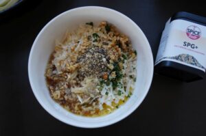 Anschließend wird das Parmesan-Topping angerührt. Die Butter wird erwärmt und verflüssigt, die Walnüsse und die Petersilie werden fein gehackt und der Parmesan wird gerieben. Dann werden alle Zutaten für das Topping in eine Schale gegeben und miteinander verrührt.