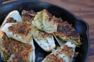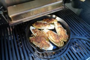 Das Topping wird dann gleichmäßig auf dem Chicorée verteilt und glatt gestrichen. Im vorgeheizten Grill oder Backofen wird der Chicorée anschließend gratiniert. Wir haben dieses Rezept im Enders UNIQ Pro Gasgrill mit dem Cruster zubereitet. Mit dem Cruster wird der Chicorée am Ende der Garzeit gratiniert. Das dauert dann nur wenige Sekunden, da das die Kruste sonst zu schnell dunkel wird. Daher haben wir den Chicorée zunächst bei 160°C indirekter Hitze für 25 Minuten gegrillt, dann den Cruster aufgeheizt und das Parmesantopping für rund 20 Sekungen mit Oberhitze gratiniert.