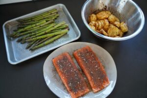 Los geht es mit dem Würzen des Lachsfilets, der Kartoffeln und des grünen Spargels. Der grüne Spargel muss nicht geschält werden. Es werden lediglich die Enden (ca. 2-3 cm) abgeschnitten, da sie meist trocken und holzig sind. Dann wird der Spargel mit Olivenöl benetzt und mit Salz und Pfeffer gewürzt. Das Lachsfilet bereiten wir mit Haut zu. Das Fischgewürz wird großzügig auf das Lachsfilet gestreut. Wenn nicht viel Zeit ist, kann man den Lachs auch sofort in der Heißluftfritteuse zubereiten, es empfiehlt sich aber den Lachs bereits einige Stunden (oder über Nacht) vor der Zubereitung zu würzen und im Kühlschrank durchziehen zu lassen. Die Kartoffeln können ungekocht verwendet werden. Die Kartoffeln werden geschält, in ca. 1 cm dicke Scheiben geschnitten und in einer Schale mit dem Öl und der Gewürzmischung vermengt.