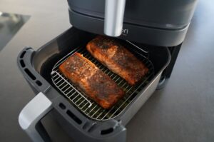 Dann werden beide Körbe in den Air Fryer gesteckt und die Garzeiten werden eingeschaltet. Die Kartoffel werden für 25 Minuten bei 180°C zubereitet, der Lachs und der Spargel bei 170°C und 18 Minuten Garzeit. Dank Sync-Funktion startet zunächst der obere Korb mit den Kartoffeln und nach 7 Minuten schaltet sich der untere Korb automatisch dazu, so dass beide Körbe zeitgleich fertig sind.