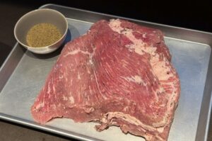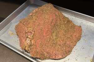 Am Ende der Pökelzeit wird die Rinderbrust aus dem Vakuum befreit und unter fließendem kalten Wasser komplett abgespült. Die Gewürze sollten dabei nahezu komplett entfernt werden. Zusätzliches Wässern ist nicht erforderlich. Dann wird das Fleisch gründlich trocken getupft und aus den Zutaten für den Würz-Rub wird eine Gewürzmischung hergestellt. Pfeffer und Koriander wird mit einem Mörser grob zerstoßen und mit den anderen Gewürzen zu einem Rub vermischt, welcher dünn auf die Rinderbrust aufgetragen wird.