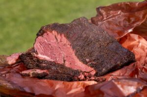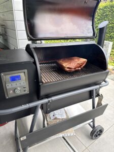 Weiter geht es am Grill, bzw. am Smoker. Wir haben das Pastrami auf dem Moesta-BBQ Sheriff Pelletgrill bei 125°C geräuchert. Die Rinderbrust wird zunächst 3 Stunden im Holzrauch gegart. Anschließend wird sie in Butcher Paper eingewickelt und bis zu einer Kerntemperatur von etwa 95°C gegart. Dann ist das Fleisch butterzart und weich wie ein klassisches Beef Brisket. Die gesamte Garzeit beträgt ca. 7 Stunden. Die Garzeit ist jedoch stark abhängig von der Größe der Rinderbrust und der Gartemperatur.