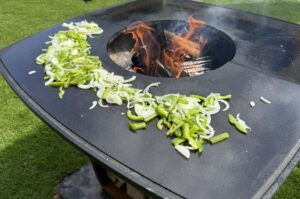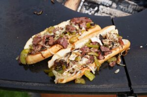 Wenn das Pastrami fertig ist, wird es bei 80 Grad im Sheriff warmgehalten (oder in einer Isolierbox gelagert). In der Zwischenzeit werden die Zwiebel und Paprika in Streifen geschnitten und angegrillt. Wir nutzen dafür den Moesta ONE Feuerplattengrill, da er genug Fläche auf der Feuerplatte hat. Das Gemüse wird mit etwas Öl gegrillt und mit einer Prise Salz und Pfeffer gewürzt.