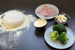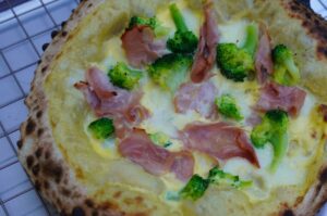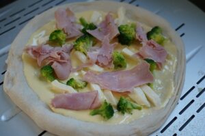 Wenn der Pizzateig ausgeformt ist, wird er gleichmäßig mit der Sauce Hollandaise bestrichen. Darauf wird dann gleichmäßig der Fior di Latte Mozzarella verteilt. Der Brokkoli wird in kleinen Stücken auf der Pizza verteilt. Der Schinken wird in kleine Stücke gezupft und ebenfalls auf der Pizza verteilt. Die Pizza Hollandaise wird vorsichtig, aber mit Schwung auf den Pizzaschieber gezogen, welcher vorab mit ein wenig Semola bestreut wird. Dann wird die Pizza nochmal rund gezogen und ist dann bereit für den Pizzaofen.