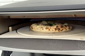 Das Backen der Pizza Hollandaise geht im Witt Piccolo Rotante sehr schnell und man kann der Pizza beim Aufgehen förmlich zusehen. Bereits nach 60-70 Sekunden ist die Pizza fertig und kann aus dem Ofen genommen werden. Das für neapolitanische Pizza typische Leoparding ist jetzt gut erkennbar.