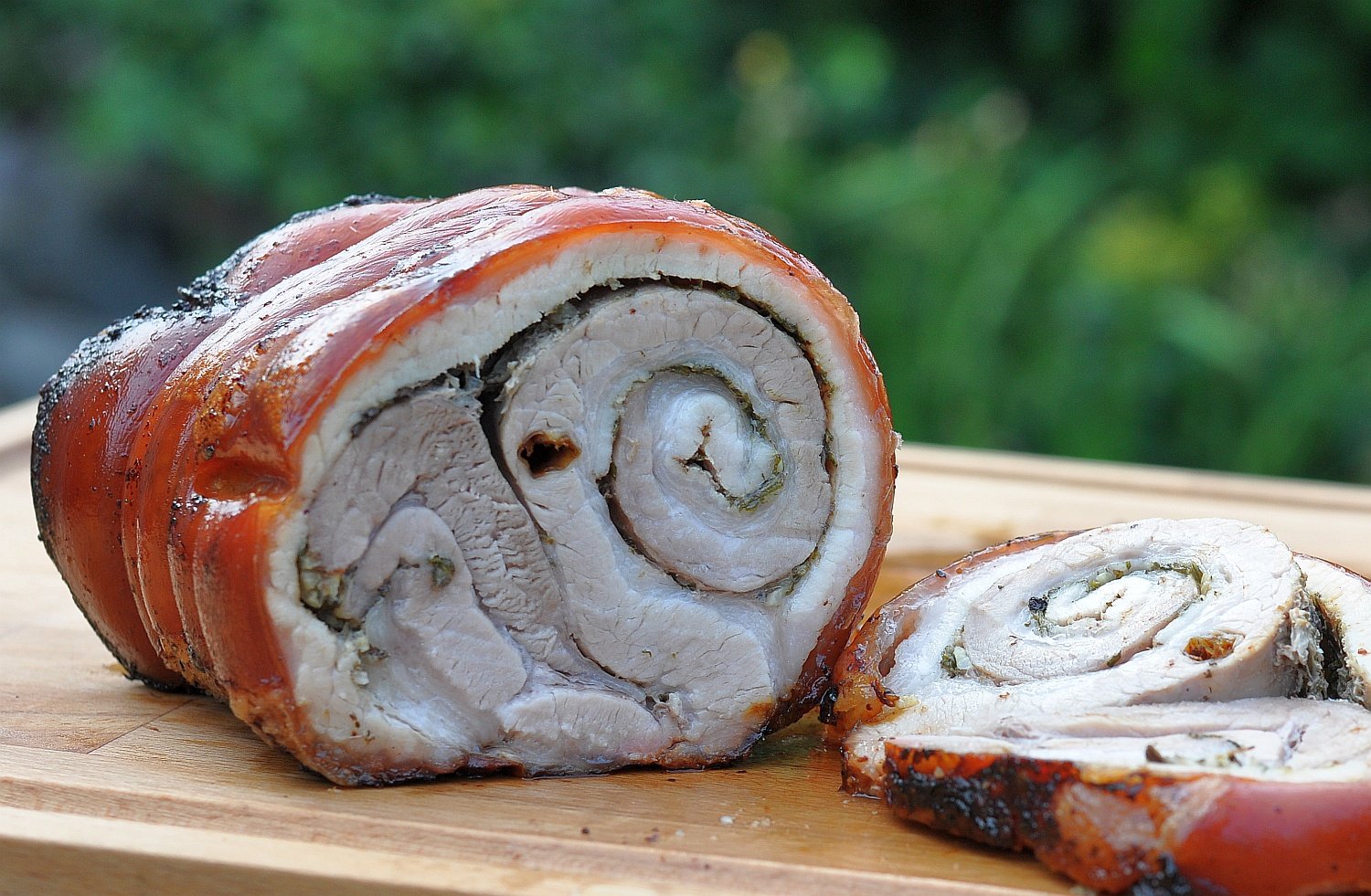 Den Grill habe ich auf 180 Grad Celsius indirekte Hitze eingeregelt und dann den Moesta-Drehspiess mit dem Porchetta aufgesetzt. Die Garzeit beträgt etwa 2-2,5 Stunden, bis eine Kerntemperatur von etwa 80 Grad erreicht ist. Tipp: Die Moesta-BBQ Rotisserie hat eine Thermometer-Durchführung, so dass man das Maverick ET-733 Grillthermometer zur Kerntemperatur-Messung verwenden kann, ohne dass sich das Fühlerkabel am Drehspiess aufwickelt.