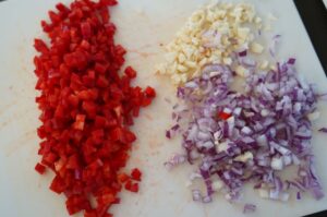 Wir starten mit den Vorbereitungen und schneiden zunächst das Gemüse klein. Die Spitzpaprika wird entkernt und fein gewürfelt. Die rote Zwiebel wird abgezogen und ebenfalls fein gewürfelt. Die Knoblauchzehen werden abgezogen und fein gehackt.