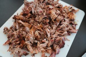 Im nächsten Schritt wird das Pulled Pork mit einem scharfen Messer in kleinere Stücke geschnitten. Da das Fleisch in teils längere Fasern gezupft wird, bietet es sich an, diese Stücke noch etwas zu zerkleinern. Wir schneiden daher einfach mit 1 cm Abstand durch das Pulled Pork. Einmal vertikal und einmal horizontal und schon hat man maximal 1 cm große Stücke, was ideal für unseren Pulled Pork Nudelauflauf ist.