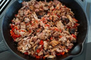 Weiter geht es in der Pfanne. Paprika, Zwiebeln und Knoblauch werden für 3-4 Minuten in einer heißen Pfanne angeröstet. Anschließend kommt das Pulled Pork und das Tomatenmark hinzu, was ebenfalls für 3-4 Minuten mit angeröstet wird.