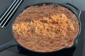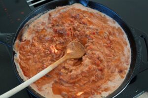 Wenn das Pulled Pork ebenfalls erwärmt ist, werden die passierten Tomaten, die Sahne und das Wasser eingerührt. Außerdem wird die Gemüsebrühe eingerührt und die Sauce wird kurz aufgekocht.