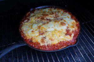 Wenn der Käse über den Nudeln verteilt ist, wird die Pfanne bei 200°C indirekter Hitze für 30 Minuten in den Grill gestellt. Wir nutzen dafür den Moesta-BBQ Sheriff Pelletgrill. Alternativ in den Backofen bei 200°C Ober-/Unterhitze.