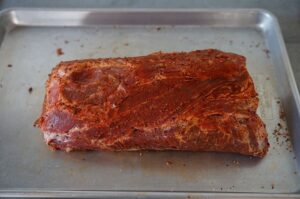 Zunächst wird der Schweinenacken pariert und von etwaigen Sehnen und Fettauflagen befreit. Paprika, Pfeffer und Salz wird zu einer Gewürzmischung zusammengerührt und der Schweinenacken wird rundum mit der Mischung eingerieben.