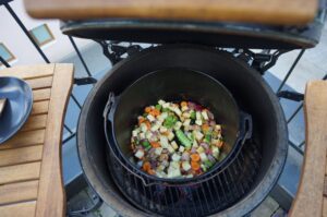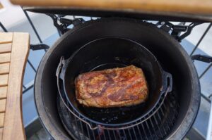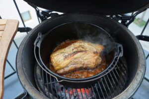 Anschließend wird der angebratene Schweinenacken auf dem Gemüsebett platziert und für 90 Minuten geschmort (bei ca. 160°C). Dabei ist es hilfreich, wenn das Big Green Egg auf indirekte Hitze umgebaut wird und der convEGGtor eingelegt wird, um den Dutch Oven vor zu viel direkter Hitze abzuschirmen. Wer die Temperatur im Big Green Egg im Griff hat, kann es auch bei direkter Hitze machen, denn es befindet sich genug Flüssigkeit im Dutch Oven.