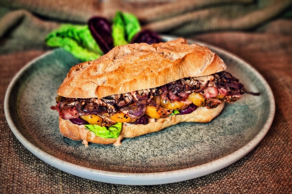 Wenn der Käse angeschmolzen ist, wird das Filet vom Grill genommen und vor dem Anschnitt 4-5 Minuten ruhen gelassen, damit der Fleischsaft beim Anschnitt nicht ausläuft und das Filet schön saftig bleibt. Währenddessen werden die karamellisierten Zwiebeln, sowie der Bacon nochmal kurz auf die Gussplatte gegeben, damit sie wieder etwas Temperatur aufnehmen und das Schweinefilet-Sandwich später warm gegessen werden kann. Jetzt wird das gegrillte Schweinefilet in etwa 5 mm dicke Scheiben aufgeschnitten und dann kann mit dem Belegen des Sandwiches begonnen werden. Die Unterhälfte des Baguettes wird mit der Burgersauce bestrichen und darauf werden abwechselnd ein paar Blätter des Salatherzens und des Radicchios gelegt. Anschließend die Schweinefiletscheiben auf das Sandwich gegeben und darüber die karamellisierten Zwiebeln und der Bacon. Die Oberseite des Baguettes wird ebenfalls mit der Sandwich-Sauce bestrichen und dann auf das belegte Sandwich gelegt.Tipp: Um den Deckel zu fixieren, empfiehlt es sich Burgerspieße zu verwenden, damit nichts verrutschen kann.