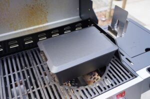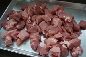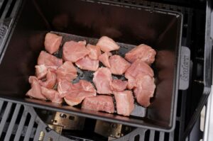 Das Anbraten sollte bei hoher, direkter Hitze erfolgen. Wir haben den Dutch Oven direkt über den beiden Turbo Zonen des Enders Boston Pro Gasgrills aufgeheizt. Wenn der Dutch Oven aufgeheizt ist, wird das Gulasch portionsweise mit etwas Butterschmalz oder Öl im Dutch Oven angebraten. Wichtig dabei ist, nicht zu viel Fleisch gleichzeitig in den Dutch Oven zu geben, damit er die Hitze hält und nicht zu sehr auskühlt. Wir haben das Gulasch in vier Portionen zu je 500 g im Dutch Oven angebraten. Dabei immer wieder wenden, damit es von allen Seiten Röstaromen bekommt. Das fertig angebratene Fleisch wird dann aus dem Dutch Oven genommen und beiseite gestellt. Dieser Vorgang wird wiederholt, bis das komplette Fleisch angebraten ist.
