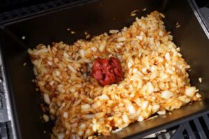 Wenn das Gulasch komplett angebraten ist, geht es den Zwiebeln weiter. Die Zwiebelwürfel werden direkt in den Bratensatz vom Fleisch gegeben. Das gibt richtig Geschmack! Die Zwiebeln werden für etwa 8-10 Minuten geschmort, dann werden auch die gehackten Knoblauchzehen hinzugegeben. Wenn die Zwiebeln angebraten sind, wird das Tomatenmark kurz mit angeröstet, jedoch nicht zu lange, damit es sonst bitter werden könnte.