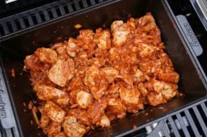 Zunächst wird das Gemüse und das Fleisch vorbereitet. Die Zwiebeln werden abgezogen und grob gewürfelt. Der Knoblauch wird abgezogen und fein gehackt. Sollte das Gulasch noch nicht portioniert sein, wird das Fleisch pariert und in 2-3 cm große Würfel geschnitten.Der Dutch Oven wird ebenfalls vorgeheizt. Egal ob auf dem Herd, dem Grill, dem Lagerfeuer oder direkt auf Briketts: hohe Hitze zum Anbraten des Gulaschs wird benötigt. Wir bereiten unser Schweinegulasch auf dem Enders Boston Pro 4 KR Turbo II Gasgrill im Enders Dutch Oven für das Switch Grid-System zu. Dieser Dutch Oven hat keine Füße, so dass man ihn auch auf dem Herd benutzen kann - sogar auf dem Induktionskochfeld. Wer Briketts verwenden möchte, sollte etwa 20 Briketts einplanen und zu Beginn möglichst viele Briketts unter dem Dutch Oven platzieren, damit das Fleisch Röstaromen bekommt. Beim späteren Schmoren wird die Hälfte der Briketts auf den Deckel gelegt. Ideal sind Kokosbriketts, da diese länger halten als Holzkohlebriketts.