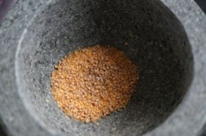 Zunächst wird der Schweinenacken pariert. Silberhaut und etwaige Fettauflagen werden abgeschnitten. Die Senfkörner werden in einen Mörser gegeben und grob zerstoßen.