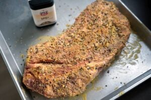 Der Schweinenacken wird dann mit beiden Senfsorten eingerieben. Darüber werden dann die gemörserten Senfkörner gegeben und zum Schluss wird die SPG+-Gewürzmischung aufgetragen und etwas angedrückt. SPG+ bedeutet nichts anderes als Salt, Pepper, Garlic und das Plus steht für Mustard. Die Kombination aus den beiden Senfsorten, den zerstoßenen Senfkörner und der Gewürzmischung sorgt am Ende für eine tolle Senfkruste auf dem Braten.