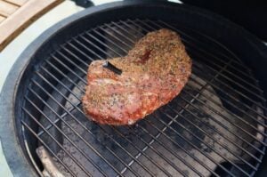 Gegrillt haben wir den Schweinenacken auf dem Big Green Egg Large Keramikgrill mit eingelegtem Conveggtor-Stein bei 170°C indirekter Hitze. Sobald der Grill auf die gewünschte Gartemperatur eingeregelt ist, wird der Braten mittig auf dem Grillrost in der indirekten Zone platziert. Die Garzeit ist abhängig von der Größe des Bratens und der Gartemperatur. Bei 170°C betrug die Garzeit unseres Bratens ca. 80 Minuten, bis eine Kerntemperatur von 76°C erreicht war.