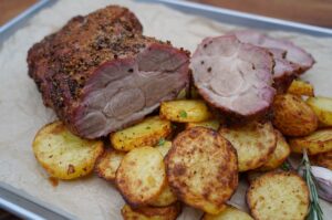 Wenn der Braten dann vom Grill genommen wird, sollte er noch 10 Minuten ruhen, bevor er angeschnitten wird. Serviert haben wir den Senfbraten mit knusprigen Knoblauchkartoffeln.