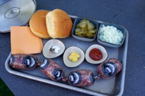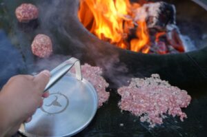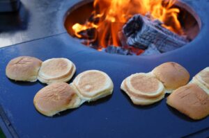 Zubereitet haben wir unsere Smashburger auf dem Moesta One Feuerplattengrill. Die Buns werden zunächst gebuttert und auf der Schnittfläche angeröstet. Wer häufiger größere Mengen Buns anröstet, sollte sich einen praktischen Butterroller zulegen, um die Buns zu buttern. Wenn die Buns auf der Schnittfläche gebuttert sind, werden sie auf die Feuerplatte gelegt und goldbraun angeröstet. Wenn die Buns angeröstet sind, werden sie vom Grill genommen und beiseite gelegt.