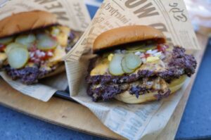 Wenn der Käse auf den beiden Patties angeschmolzen ist, werden beide Patties übereinander gelegt auf der Unterseite des Buns platziert. Darauf kommen dann etwas Senf, Ketchup, die Zwiebelwürfel und ein paar Gurkenscheiben. Zum Servieren packen wir den Burger dann in Burgertüten. Auf den perfekten Smashburger kommt übrigens keine Tomate und kein Salat! ;)