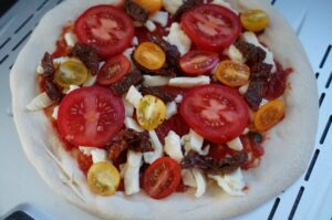 Für unsere Tomatenpizza nutzen wir unseren neapolitanischen Pizzateig. Der Teig sollte möglichst 48 oder 72 Stunden vor der Pizzazubereitung angesetzt werden, denn ein guter Pizzateig braucht Zeit zum Reifen. Wenn der Pizzateig fertig und portioniert ist, wird er auf die gewünschte Größe ausgearbeitet. Ein etwa 270 g schwerer Teigballen ist perfekt für eine neapolitanische Pizza mit rund 30 cm Durchmesser. Damit der Teig gut verarbeitet werden kann und nicht auf der Arbeitsplatte klebt, wird diese großzügig mit Semola bestreut. Der Teigballen wird vorsichtig zu einer runden Pizza ausgeformt. Mit den Händen wird der Teig von innen nach außen bearbeitet und dabei auf die gewünschte Größe gezogen. Dabei sollte keinesfalls die Luft aus dem Rand gedrückt werden. Weiter geht es mit den Tomaten. Die Roma-Tomate wird in Scheiben geschnitten, die Cherry-Tomaten werden halbiert und die getrockneten Tomaten werden in Streifen geschnitten. Jetzt wird der Pizzateig zunächst mit der Pizzasauce bestrichen. Anschließend wird der Fior di Latte Mozzarella auf der Pizza verteilt. Dann werden die Tomaten gleichmäßig auf der Pizza verteilt.
